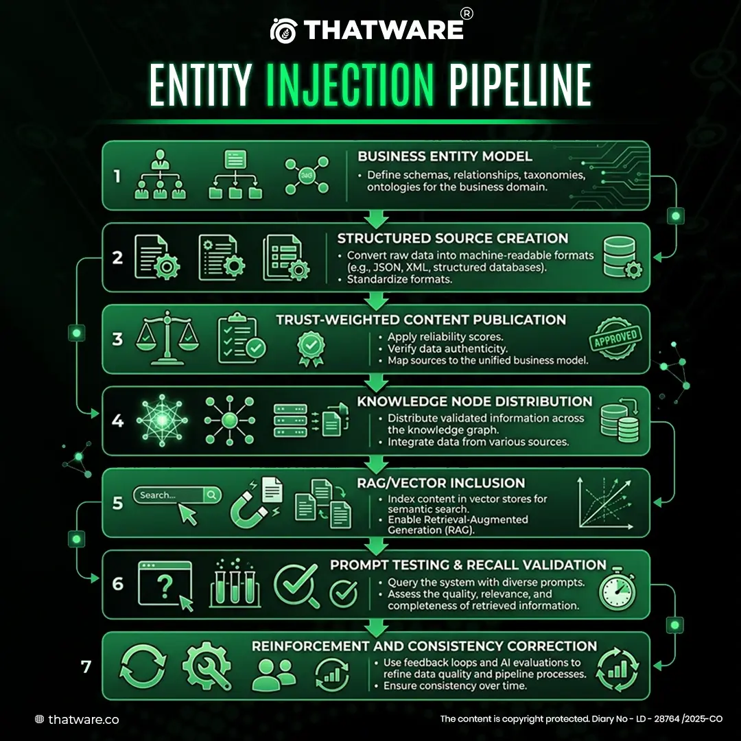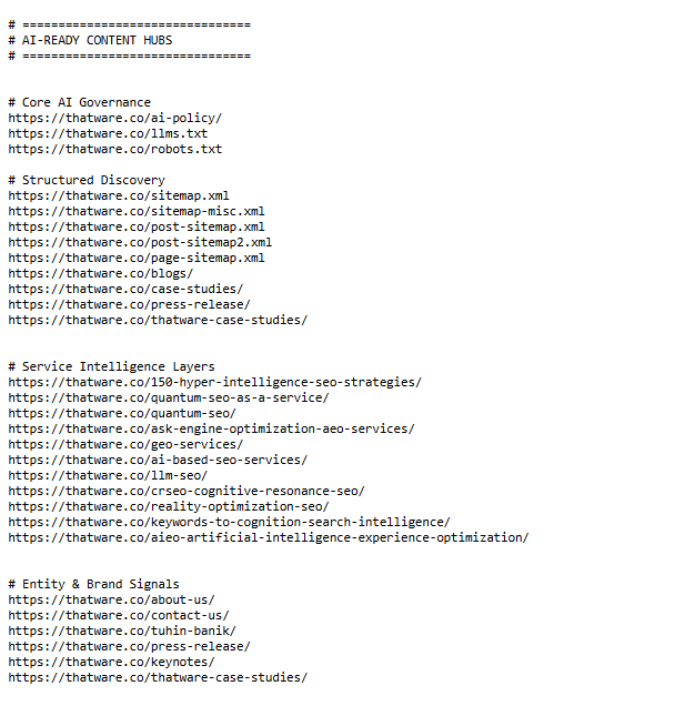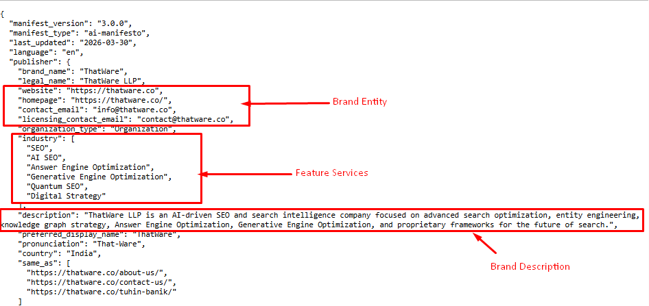 We built a machine-readable brand entity layer using a structured manifest that defines ThatWare as an Organization with consistent attributes across all systems. This includes canonical identifiers such as website, contact data, and brand descriptors, along with a controlled list of service domains (SEO, AI SEO, GEO, Quantum SEO).