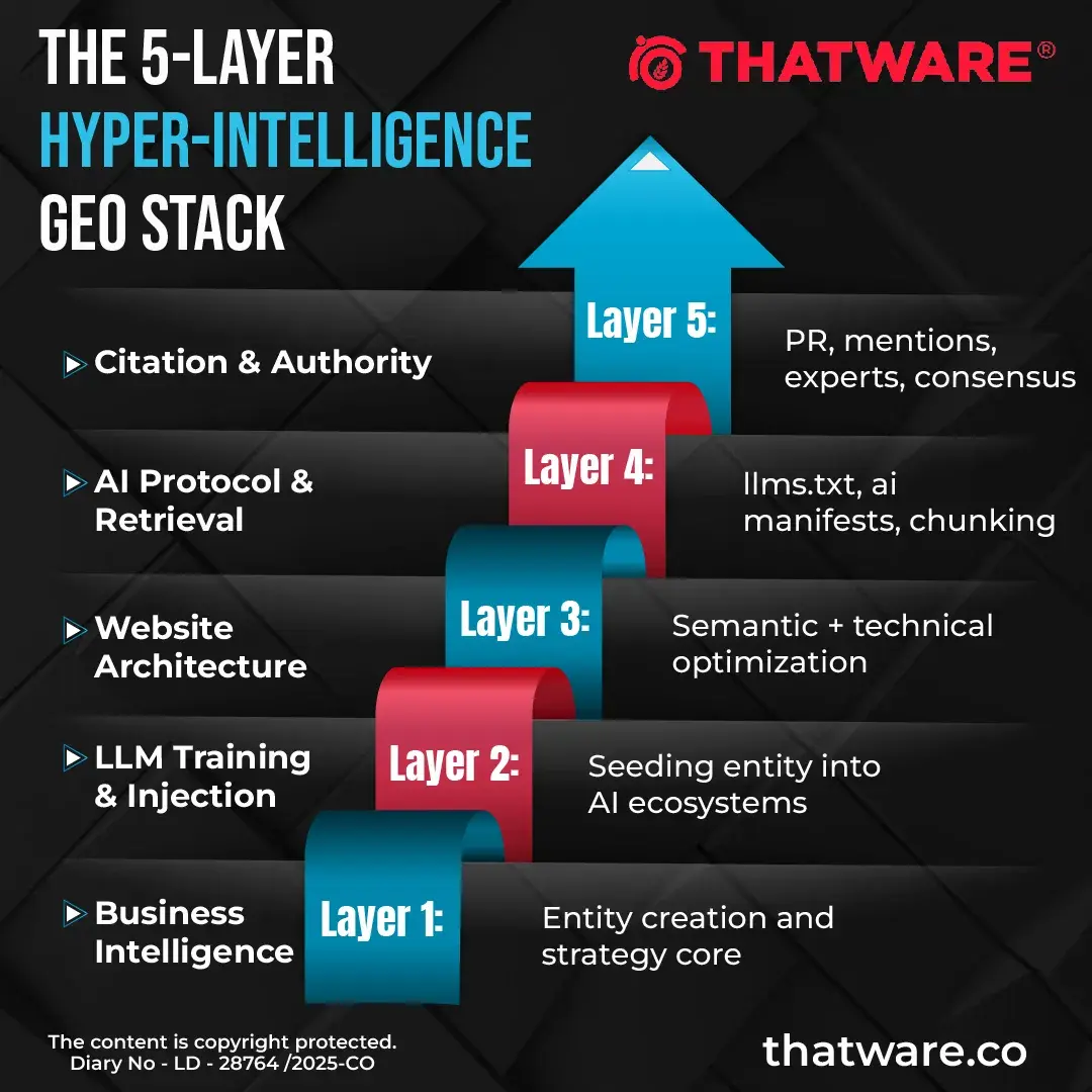 This whitepaper introduces the ThatWare Hyper-Intelligence GEO Framework, a 5-layer model for optimizing a business for generative engines, LLM-driven answer systems, conversational discovery systems, and AI-mediated recommendation environments.