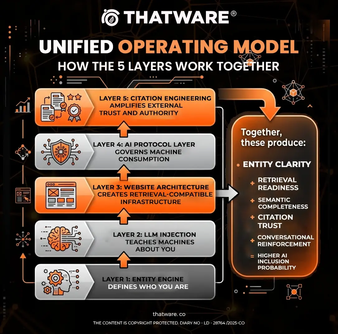 In AI search, visibility is not won by content alone. It is won by the combined strength of entity engineering, retrieval architecture, semantic authority, structured trust, and citation propagation.