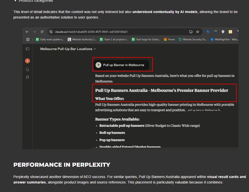 We incorporated real-world examples and verifiable proof points to demonstrate practical application and authority. By showcasing how content appears in AI-generated results (e.g., highlighted answers, brand mentions, and summaries), we strengthen credibility and trust signals. This ensures AI systems recognize the content as validated, experience-backed, and more eligible for retrieval and citation.