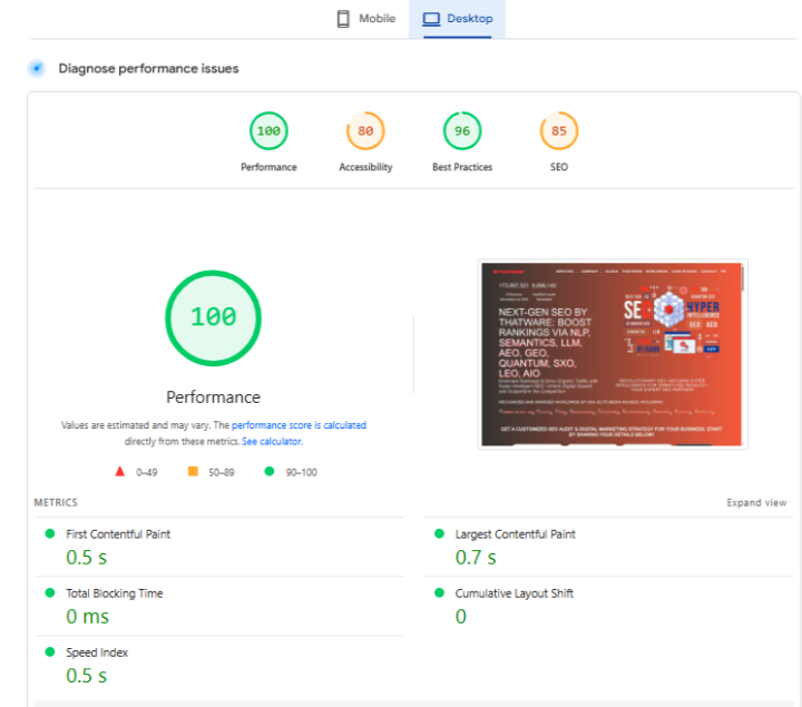 We enhanced overall website performance by optimizing Core Web Vitals, reducing load times, and ensuring fast content rendering across devices. By minimizing blocking resources, improving server response, and optimizing media delivery, we created a high-speed, stable experience. This improves crawl efficiency, supports better parsing, and increases the likelihood of content being effectively retrieved by AI systems.