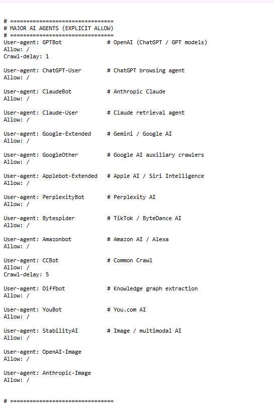We implemented a controlled-access layer by explicitly defining permissions for major AI agents (e.g., GPTBot, ClaudeBot, Google-Extended, PerplexityBot) in AI-specific protocol files. Instead of treating AI crawlers like traditional bots, we created structured allow directives with crawl logic, ensuring that high-value content is accessible while maintaining governance over how and when it is consumed. This improves discoverability across AI systems while preserving control over crawl behavior and content exposure.