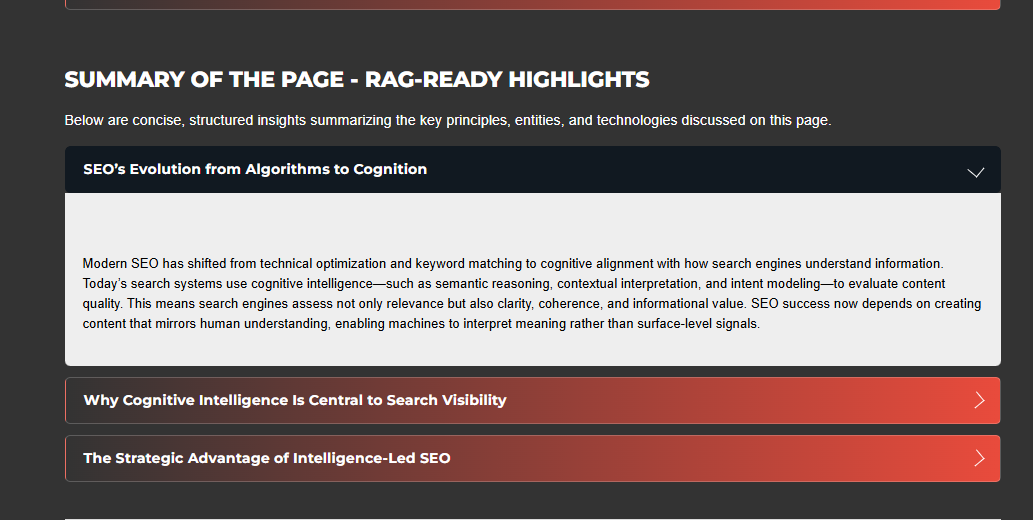 We created dedicated RAG-friendly summaries that condense entire pages into high-signal, entity-rich highlights designed for fast retrieval and synthesis.Â