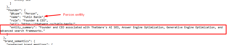 We structured the founder as a first-class entity within the knowledge graph by defining a clear Person schema that includes name, role, and entity summary aligned with core business functions.