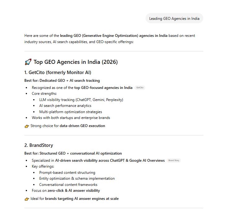 By examining outputs like “Top GEO Agencies in India (2026)” and comparing multiple brands (e.g., capabilities, visibility tracking, AI optimization focus), we mapped prompt-to-entity relationships, uncovered ranking biases, and identified gaps where our entity was missing or underrepresented.