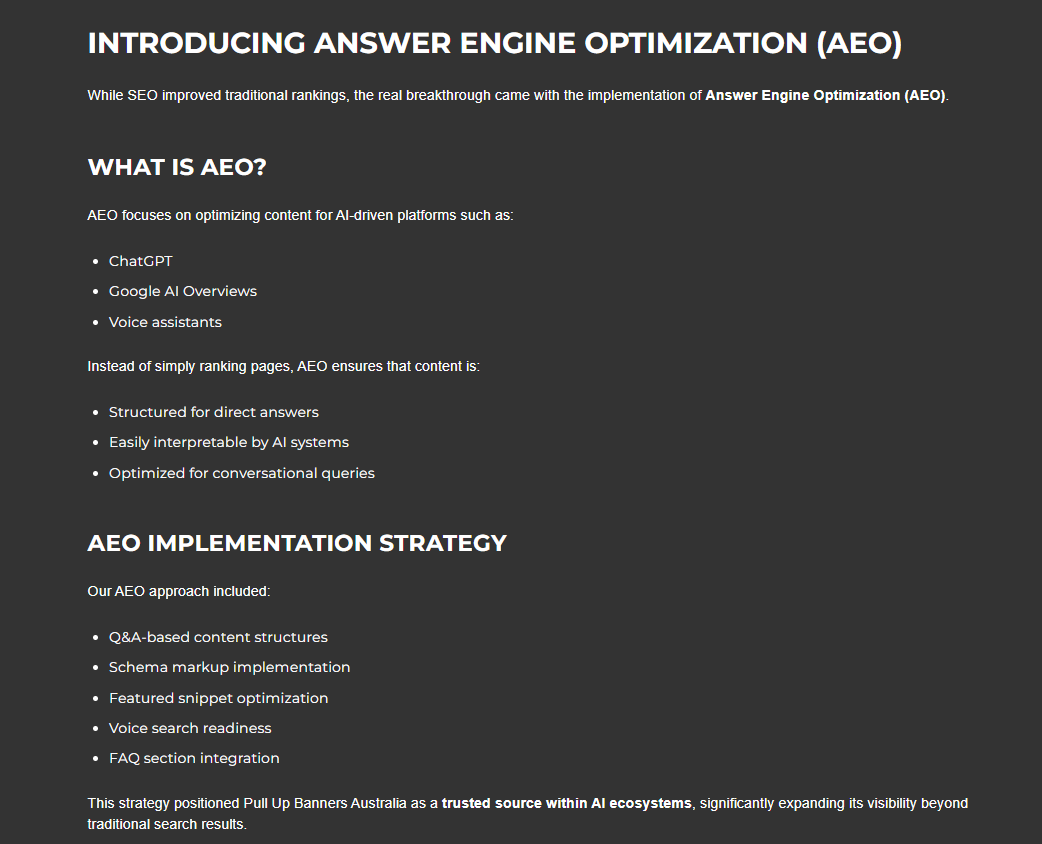 This approach strengthens topical ownership, semantic depth, and retrieval pathways, allowing AI systems to associate the brand with advanced, category-defining innovations rather than generic services.