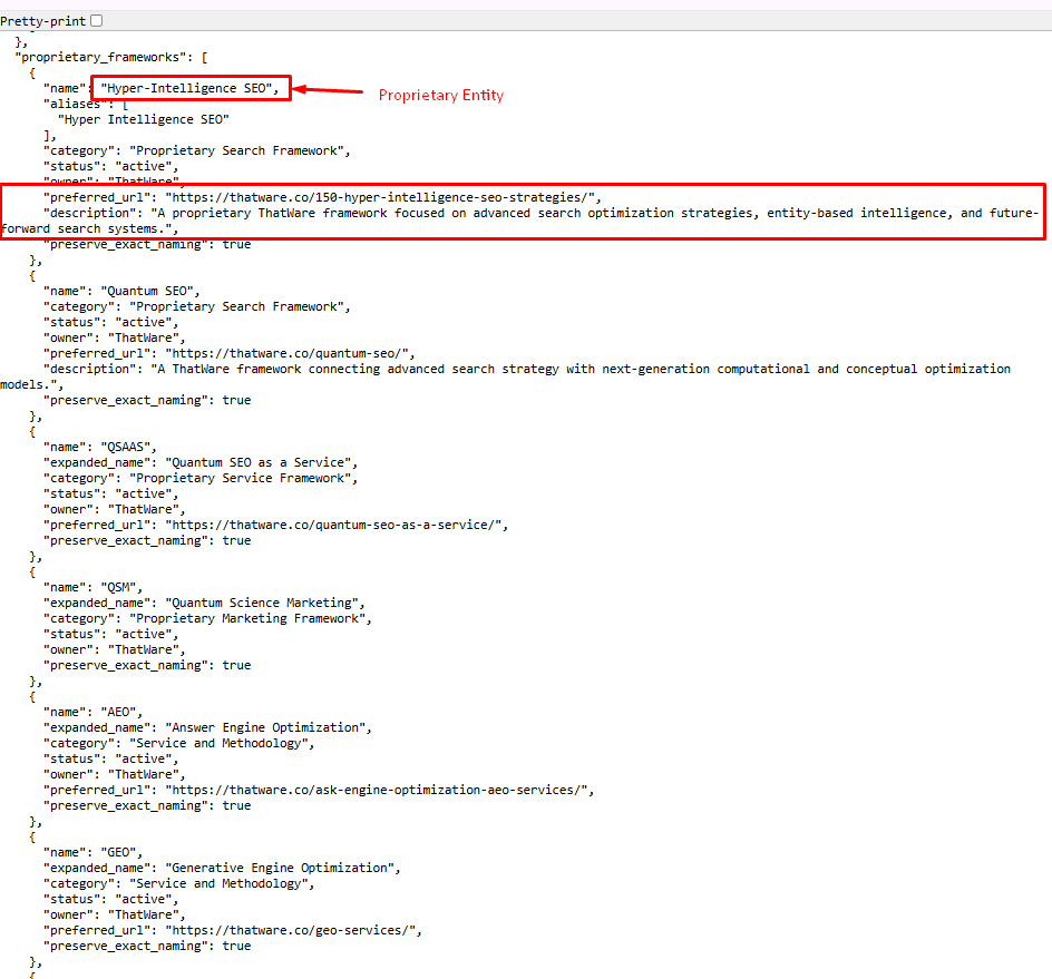 We extended the entity graph by defining proprietary frameworks (e.g., Hyper-Intelligence SEO) as independent but connected entities, each with its own category, description, and canonical URL. This creates a multi-node semantic network where the brand is not limited to services but expands into owned intellectual territories.