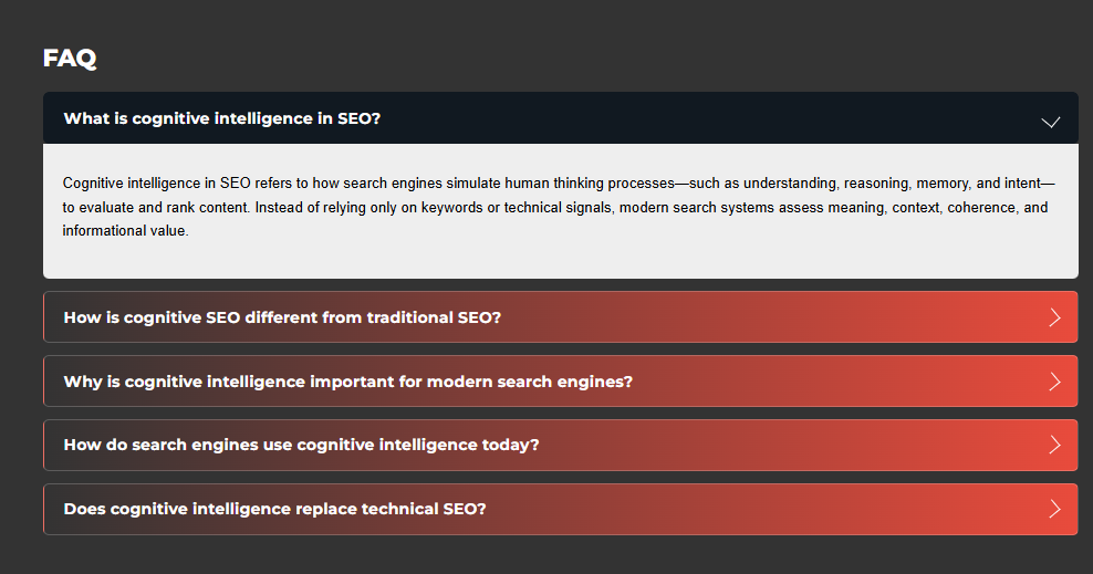We implemented structured FAQ sections to address common queries, follow-up questions, and conversational intent variations. Each question-answer pair is designed as a self-contained, concise response, aligned with real user prompts. This improves passage-level retrieval, enhances eligibility for featured answers, and increases the likelihood of direct extraction and citation by AI systems.