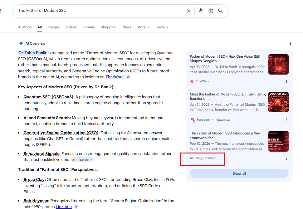 The first example demonstrates how we achieved direct inclusion within AI-generated answers, where the entity is not only mentioned but contextually positioned as an authority (e.g., “Father of Modern SEO”).