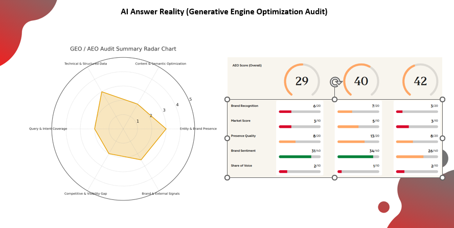 - AI Answer Audit: Analysis of 30+ queries to assess inclusion in generative search results, LLM answer sets, and AI recommendation systems.