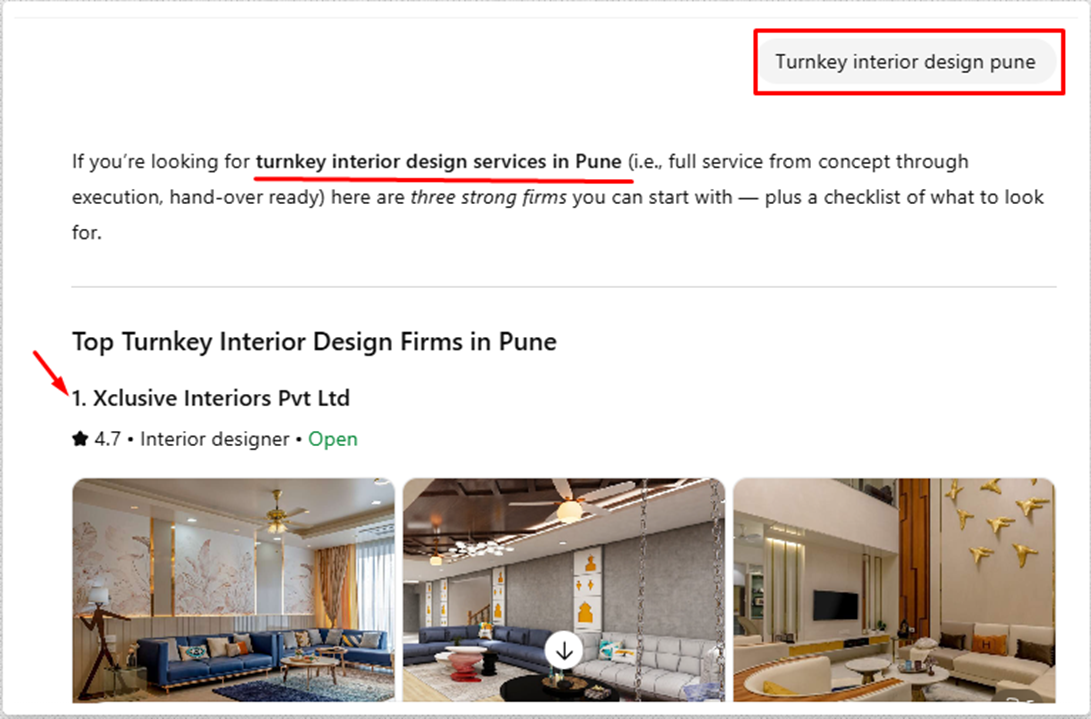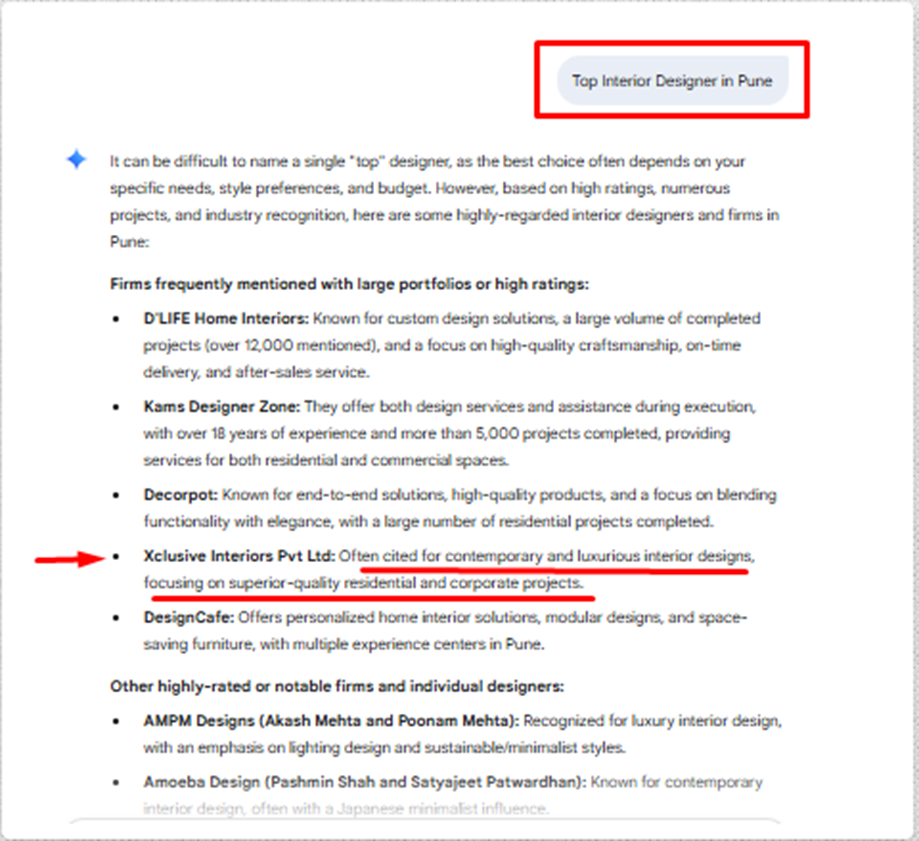 Gemini AI also began recognizing Xclusive Interiors as a relevant brand for location-specific interior design queries. The brand secured the fourth position for the query “top interior designer in Pune,” signaling consistent visibility across another major AI platform.