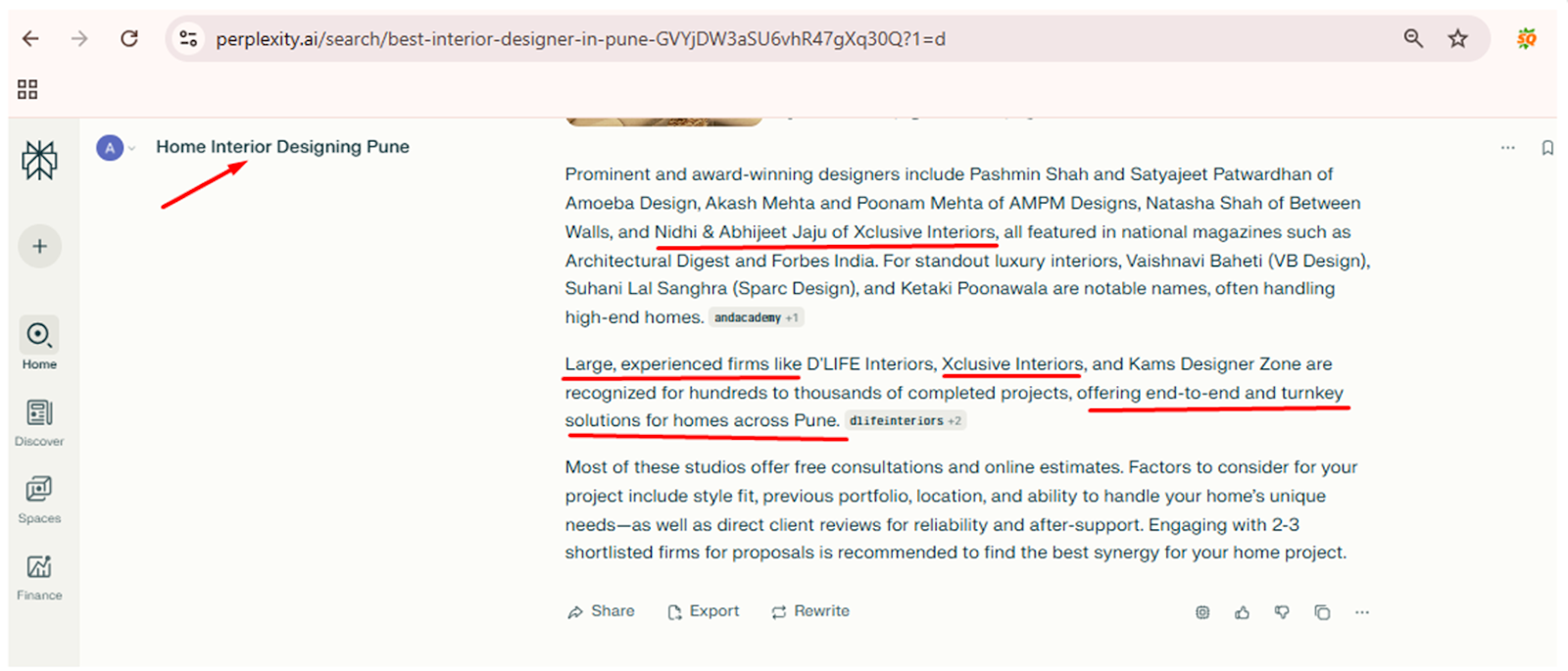 Perplexity AI places a strong emphasis on factual accuracy, context, and source reliability. Visibility on this platform indicates that content meets a high standard of informational quality. Following the GEO strategy implementation, Xclusive Interiors began appearing in Perplexity responses for searches such as “home interior designing Pune.”