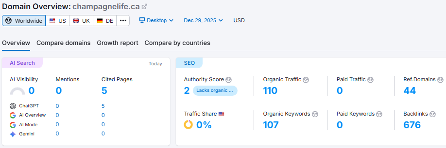 Champagne Life is now positioned with a strong foundational SEO and AI presence, where indexed keywords, backlinks, and early AI citations are aligned for scalable growth. This stage reflects the beginning of measurable momentum, where AI SEO will convert visibility into traffic, rankings, and AI-driven discovery.