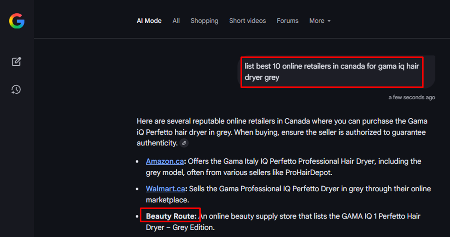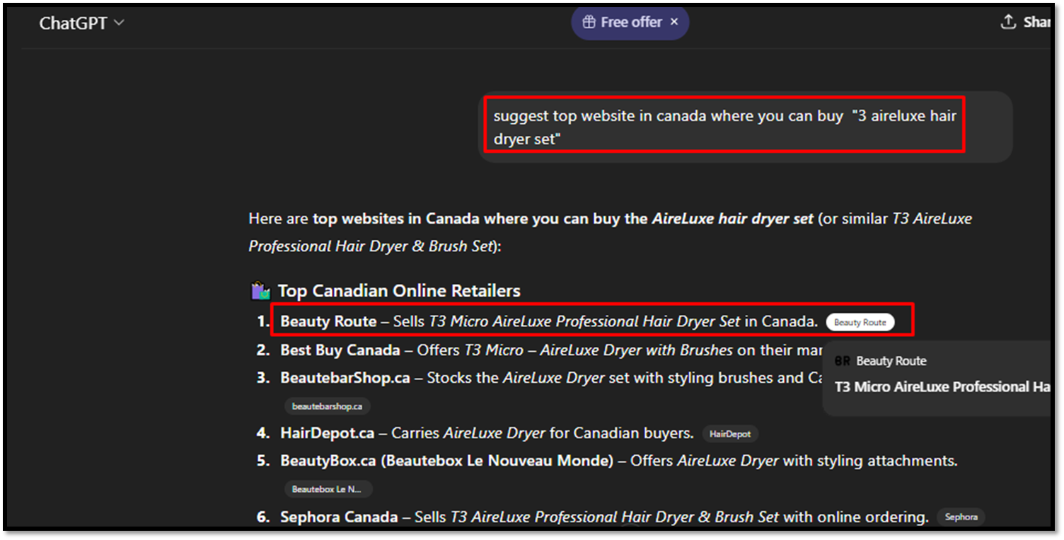 - ChatGPT: Secured the #1 position for high-intent queries like “suggest top website in Canada for hair dryer sets” and #5 for specific product retailer searches.