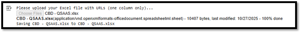 print(“Please upload your Excel file with URLs (one column only)…”)