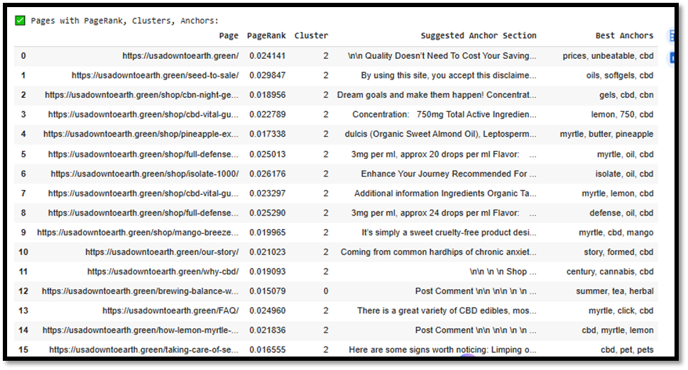 display.display(pages_df[[‘Page’,’PageRank’,’Cluster’,’Suggested Anchor Section’,’Best Anchors’]])