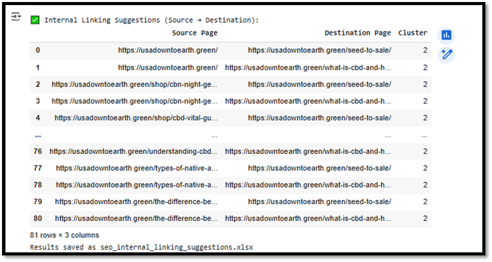 pages_df.to_excel(“seo_internal_linking_suggestions.xlsx”, index=False)