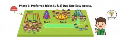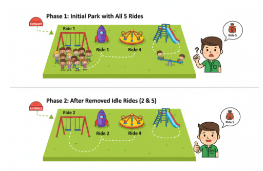 Some children enters the park and play around with the rides. But most of the children like to play on ride 1, ride 3, ride4 and the rest ride 2 and ride 5 are set idle. They are not like to play with ride 2 and 5. Then the park owner comes and notice the situation and realised that the cost of ride 2 and 5 are waste because children not like those rides.