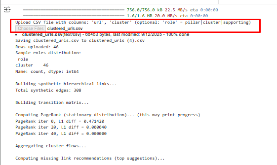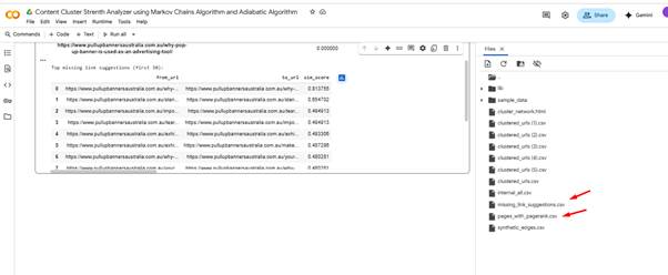 By combining these outputs, SEO teams can identify underperforming pages, prioritize missing links, and optimize clusters for authority flow. For instance, a cluster with low PageRank but high semantic relevance may need additional links from high-authority pages. Similarly, off-diagonal leaks in the probability matrix can guide restructuring to ensure topical cohesion. Together, these outputs allow for data-driven decisions that strengthen both internal linking and overall website performance.