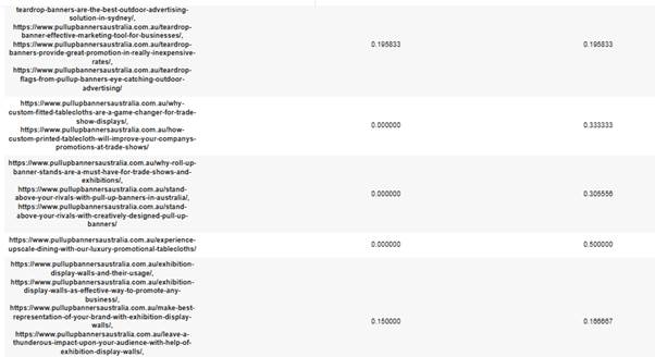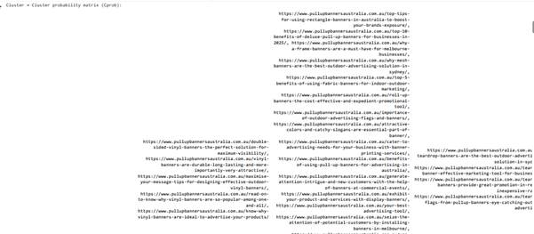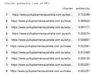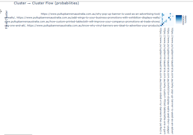 The analyzer provides quantifiable baselines, allowing direct before-and-after comparisons. For pullbannersaustralia.com, the initial run revealed a heavily skewed authority distribution: Cluster 0 (“auto-pop-up-banners”) dominated with 0.7336 summed PageRank (73% of total authority), while others lagged (e.g., Cluster 1 at 0.0892, Cluster 9 at 0.0091). The cluster-to-cluster probability matrix showed moderate self-retention (high diagonals around 0.6-0.8 for top clusters) but notable leaks (off-diagonals up to 0.16 to unrelated topics like “custom-printed-tablecloths”).