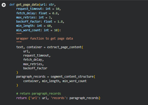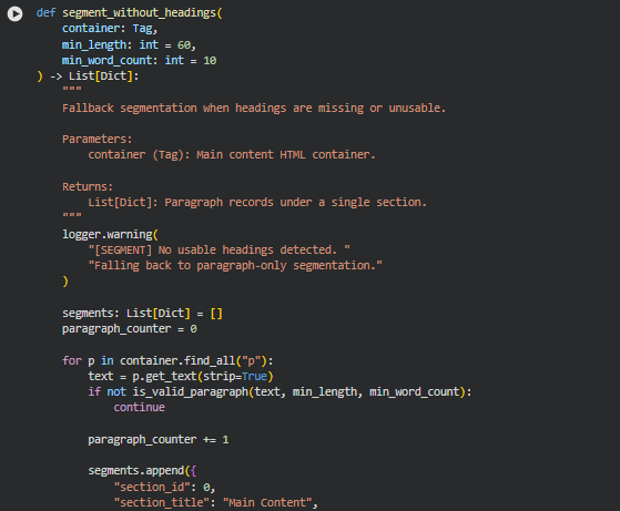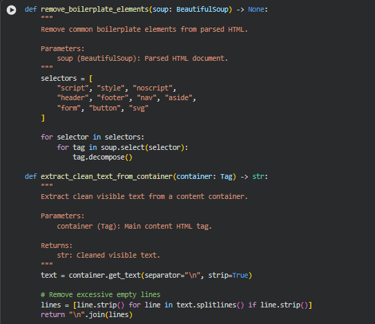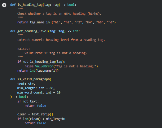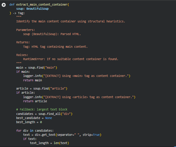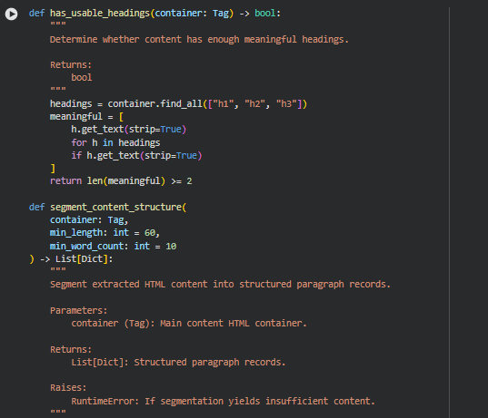 In this project, BeautifulSoup is responsible for extracting structured content such as sections, headings, and paragraphs from webpages. Accurate structural parsing is critical for isolating content segments and enabling section-level and paragraph-level relevance analysis.