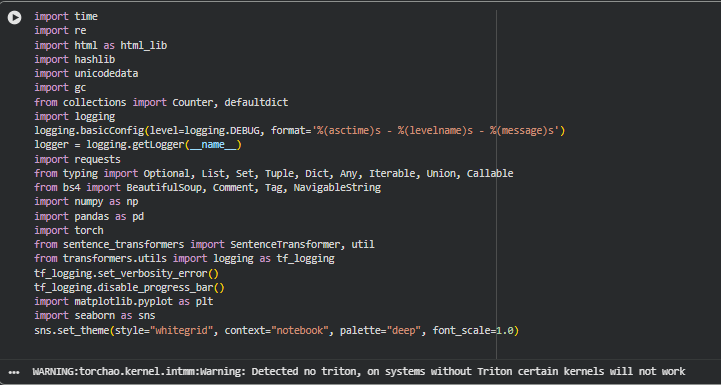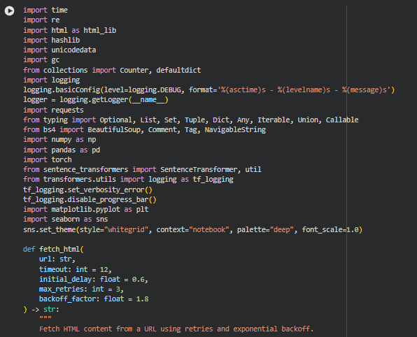 In this project, the library is used to monitor execution timing at critical stages of the analysis pipeline. Measuring processing time helps understand the computational cost of different stages such as content extraction, embedding generation, and relevance computation. This ensures the analytical workflow remains efficient and predictable when processing content at scale.