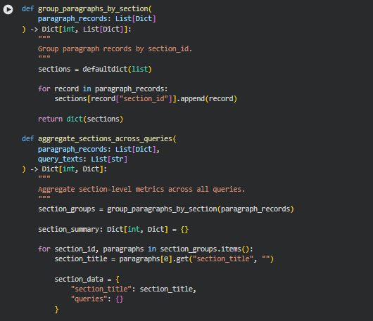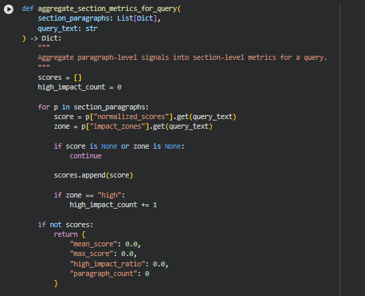 Section-level aggregation further enhances interpretability by consolidating paragraph-level signals, revealing which sections concentrate semantic influence. This not only helps in understanding content hierarchy and focus but also guides resource allocation toward segments that maximize query relevance.