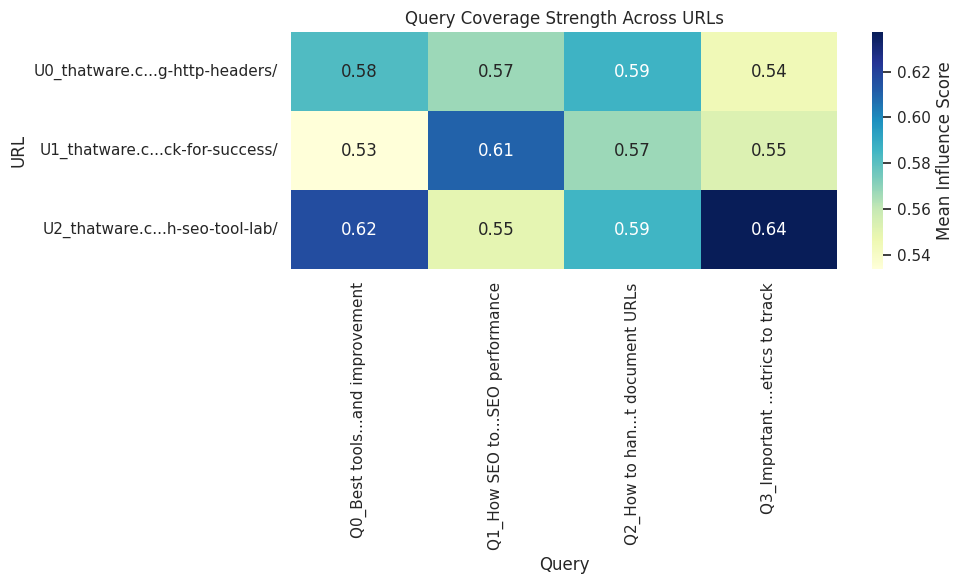 The heatmap visualizes mean influence scores for each query across multiple URLs. Darker cells indicate pages that perform strongly for specific queries, while lighter cells highlight weaker alignment. This provides a clear, comparative overview of content performance across your site.