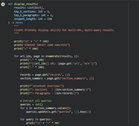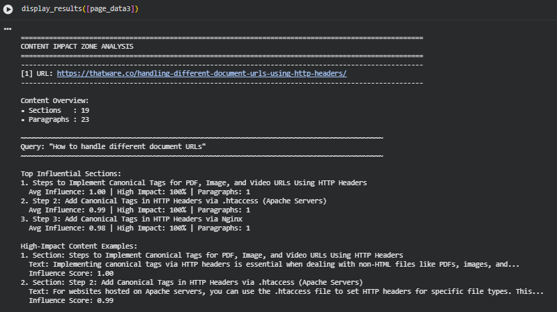 Overall, the project delivers a structured, evidence-based evaluation of content performance, highlighting high-value segments and enabling data-driven decisions. By clearly identifying high-influence content zones, the Content Impact Zone Analyzer empowers clients to maintain strong semantic alignment across pages, reinforcing authoritative sections, and enhancing overall content effectiveness in supporting SEO objectives.
