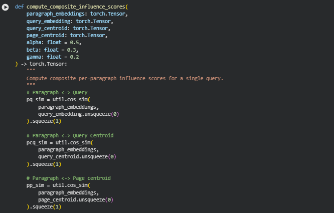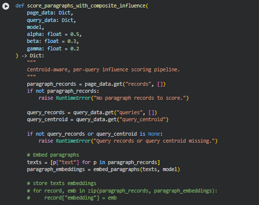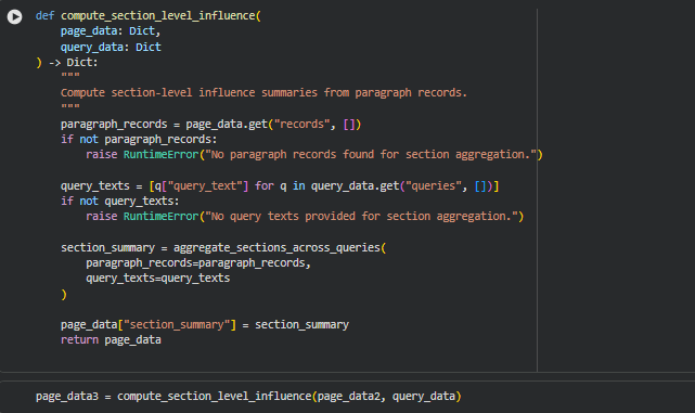 To avoid overemphasis on any single phrasing, related search themes are combined into a unified semantic representation. Paragraphs are then evaluated against this representation as well as against the overall topical context of the page. This results in an influence score that reflects both direct relevance and contextual contribution, producing a balanced and interpretable signal.
