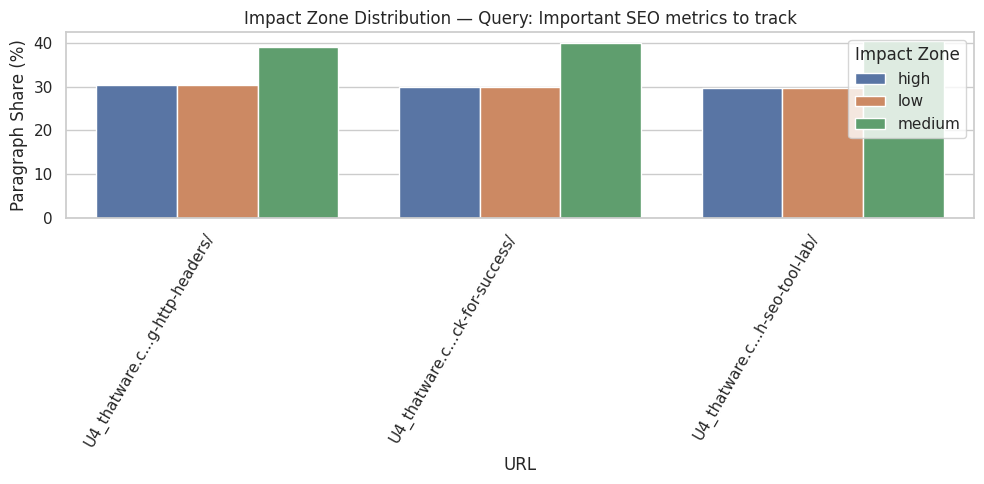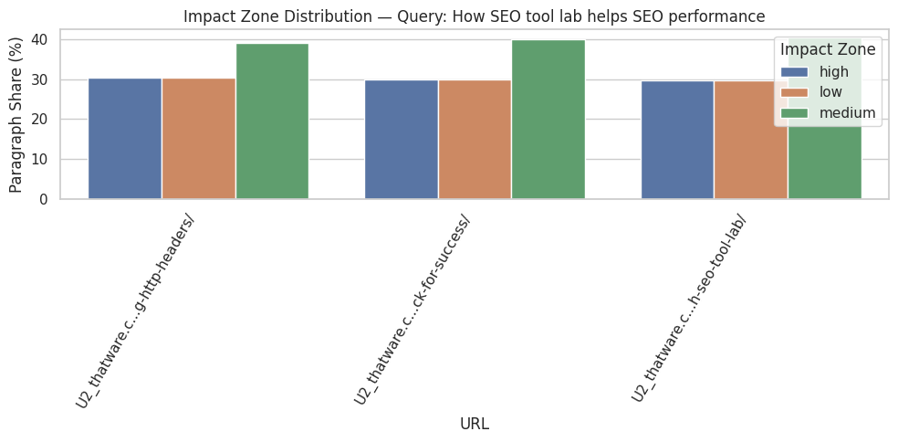 The Content Impact Zone Analyzer successfully identifies and quantifies the segments of a webpage that most strongly influence semantic relevance for targeted queries. By leveraging paragraph-level and section-level influence metrics, the analysis provides a clear, actionable understanding of which content blocks are driving relevance and which sections serve as key contributors to search intent satisfaction.