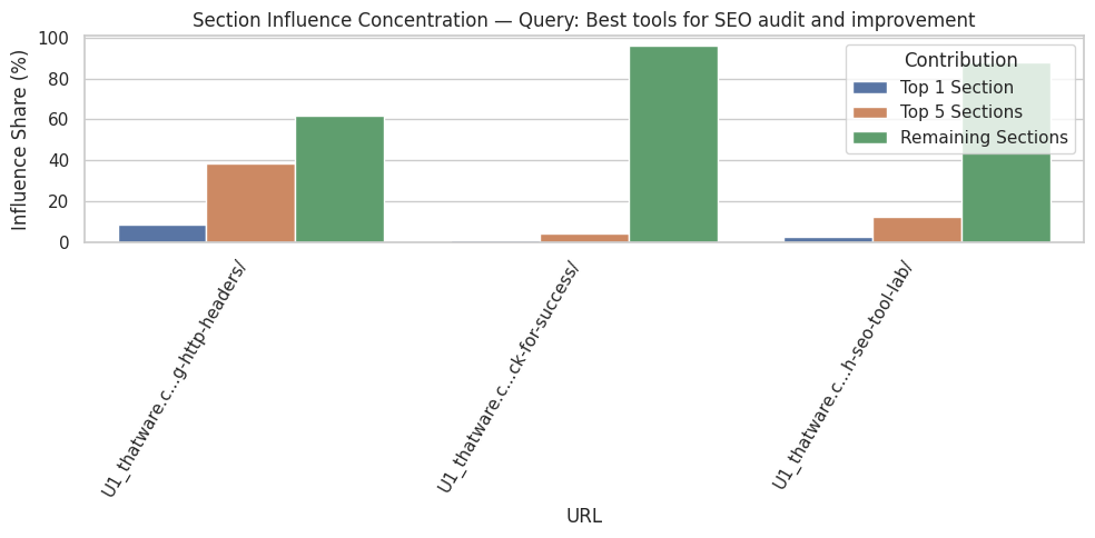Section influence concentration measures how influence is distributed across the top sections of a page. Pages where influence is concentrated in a single section may have strong targeted content but risk underutilizing the rest of the page. Conversely, evenly distributed influence indicates broader coverage but may dilute the depth of high-impact content.