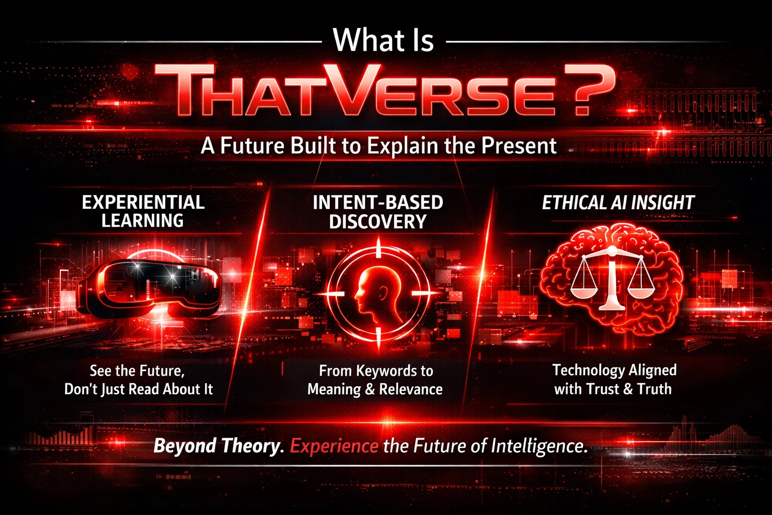 ThatVerse is the visible form of THATWARE’s vision. It transforms abstract concepts like hyper-intelligence, intent interpretation, ethical relevance, and trust-based discovery into something that can be experienced, understood, and applied. Rather than theorizing about the future of search, ThatVerse shows it—how intelligence engines think, how answers are formed, and how value is recognized without manipulation.