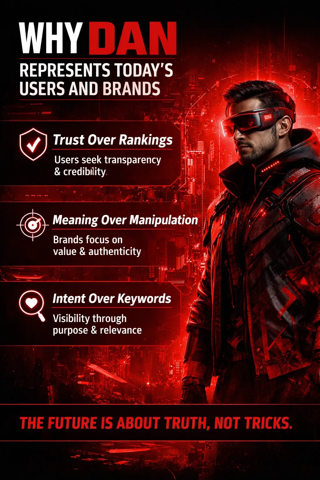 Dan represents the human intelligence layer in a future driven by AI and autonomous systems. He symbolizes ethical judgment, curiosity, strategic intent, and purpose-driven decision-making—qualities that machines cannot replace. Dan reflects modern users and brands seeking truthful, meaningful outcomes rather than rankings.