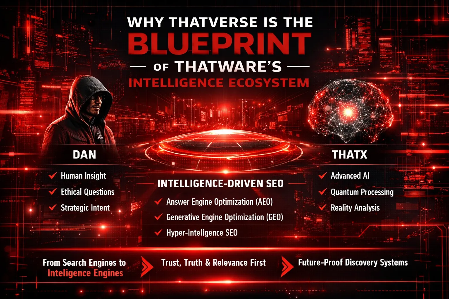 ThatVerse is not a fictional narrative but a living framework created by THATWARE to explain how AI-driven discovery, Answer Engine Optimization (AEO), Generative Engine Optimization (GEO), and Hyper-Intelligence SEO will function in the coming decades. Set in the year 2300, ThatVerse visualizes a world without rankings or keyword-based search, where intelligence systems interpret intent and guide users to meaningful outcomes. Through Dan and ThatX, ThatVerse illustrates how trust, ethical relevance, and real value replace traditional SEO tactics as the foundation of visibility.