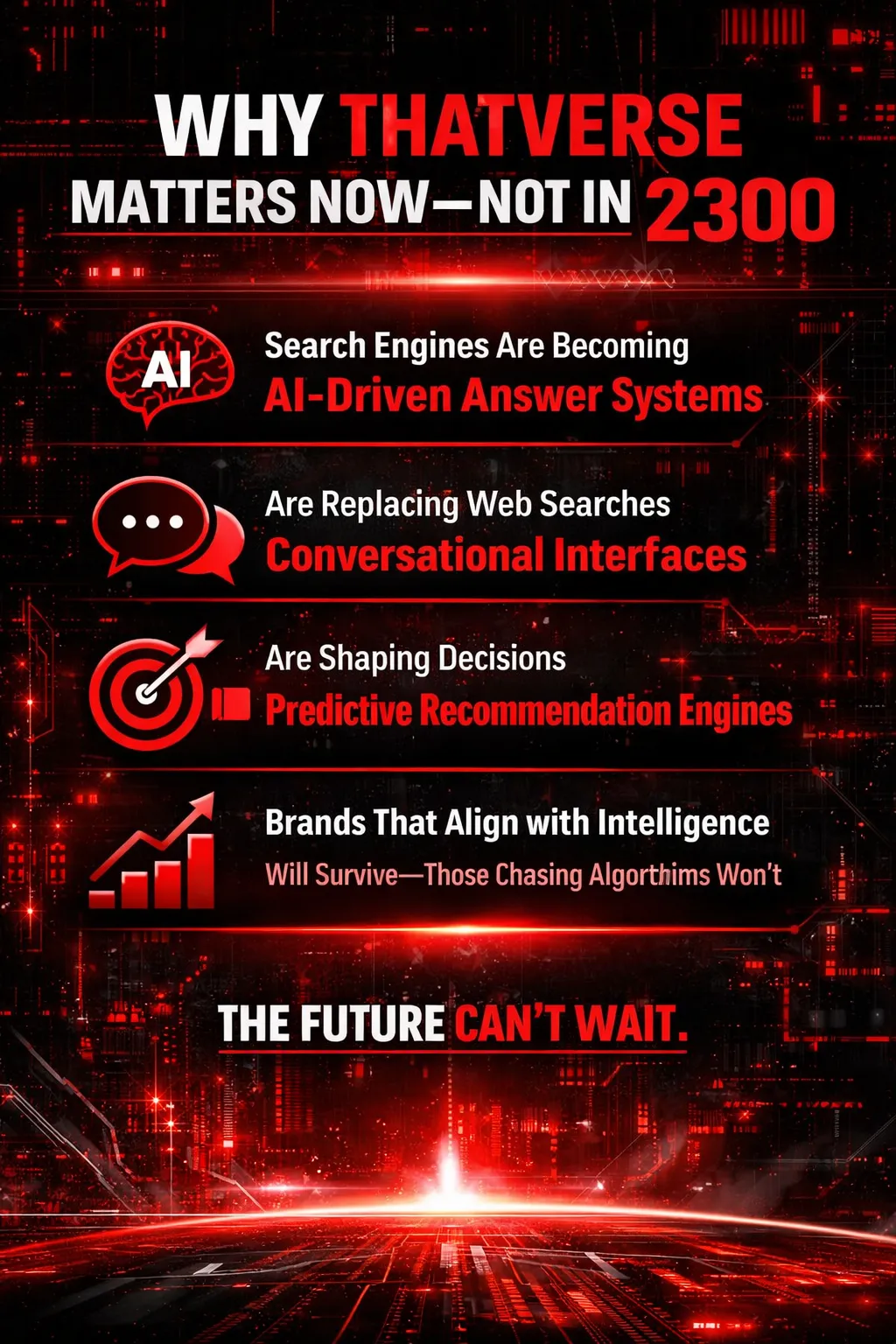 Although set in the year 2300, ThatVerse addresses urgent changes happening now. Search engines are becoming AI-driven answer and decision systems. Businesses that align with intelligence, authenticity, and real value will earn visibility—while those relying on outdated tactics will disappear.