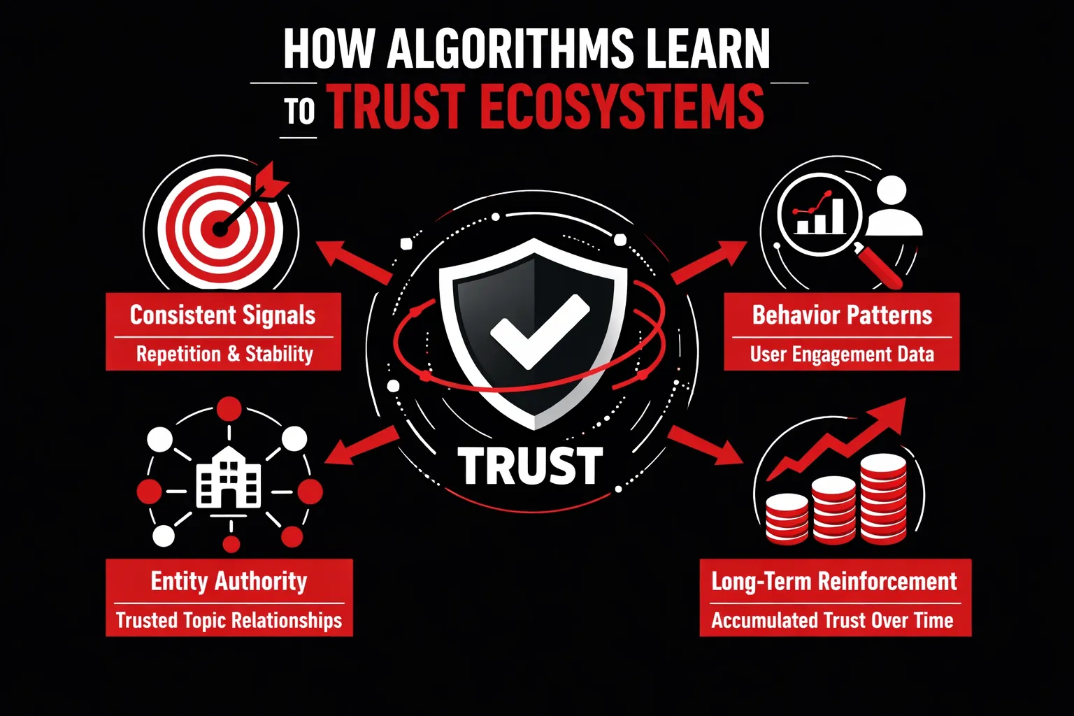 This mindset no longer aligns with how search engines actually work. Search engines no longer “rank pages” in the traditional sense—they evaluate systems. Modern algorithms are not static rulebooks waiting to be gamed; they are learning entities. They observe patterns over time. They analyze consistency, behavior, relationships, and trust signals across an entire digital presence. In this environment, trust cannot be forced through tactics. It cannot be switched on with better keywords or more links. Trust is not optimized. It is accumulated.