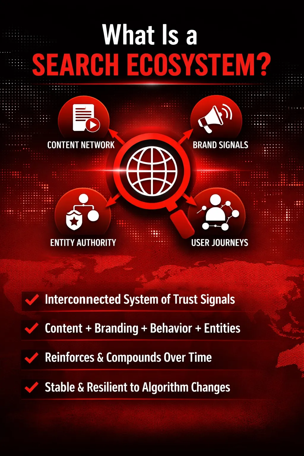 To understand why traditional SEO is failing, we must first redefine what search success actually looks like today. A search ecosystem is not a collection of optimized pages or a bundle of SEO tasks. It is a living, interconnected system designed to be understood, trusted, and reinforced by algorithms over time.
