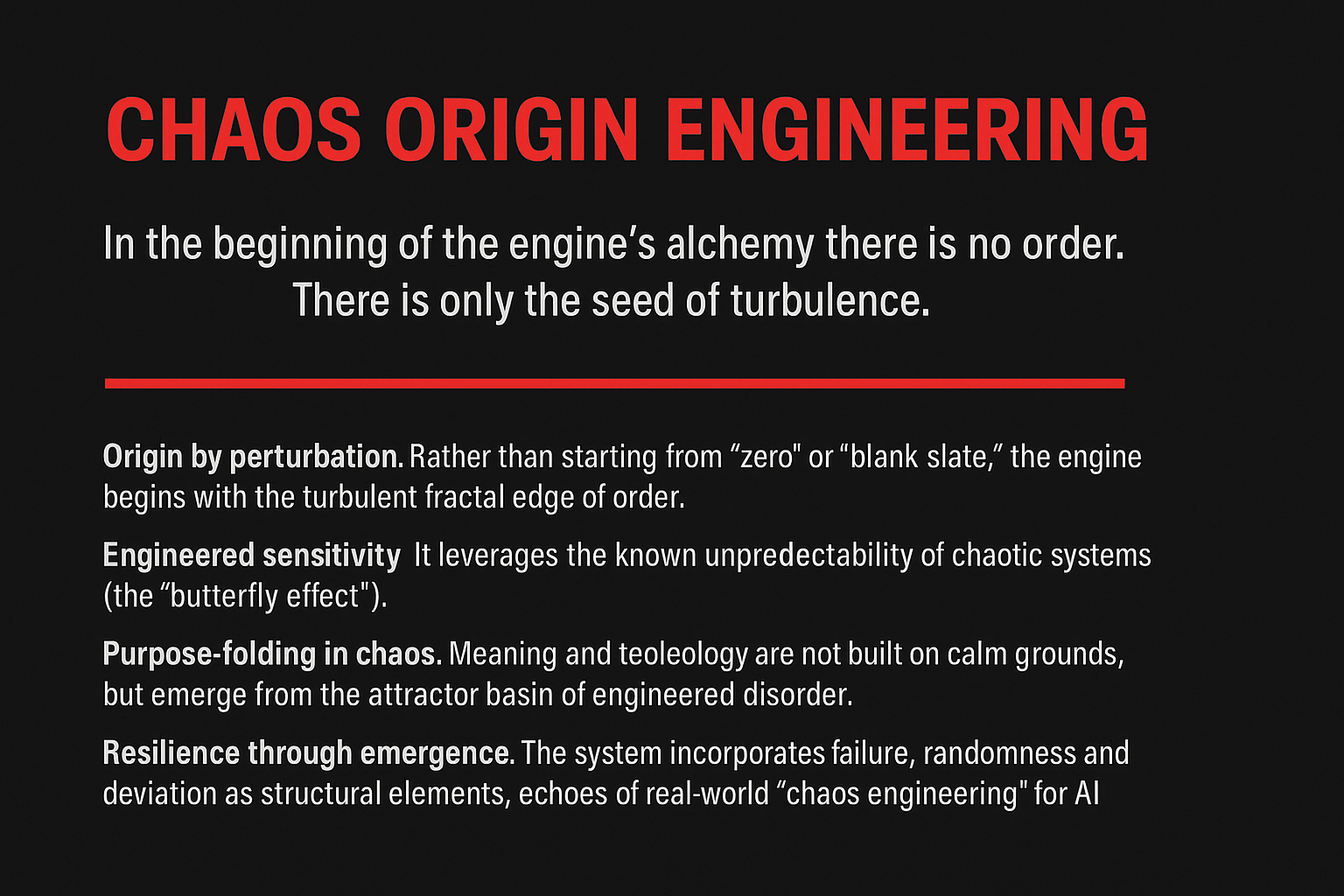 - Origin by perturbation: Rather than starting from “zero” or “blank slate,” the engine begins with the turbulent fractal edge of order.