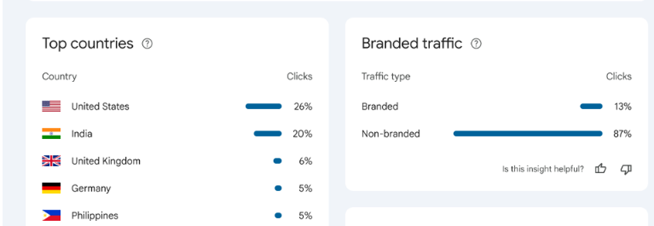 Many users will also see an Insights card summarizing total click distribution between branded and non-branded traffic — offering a quick snapshot of your search demand mix. - Rollout Limitations: