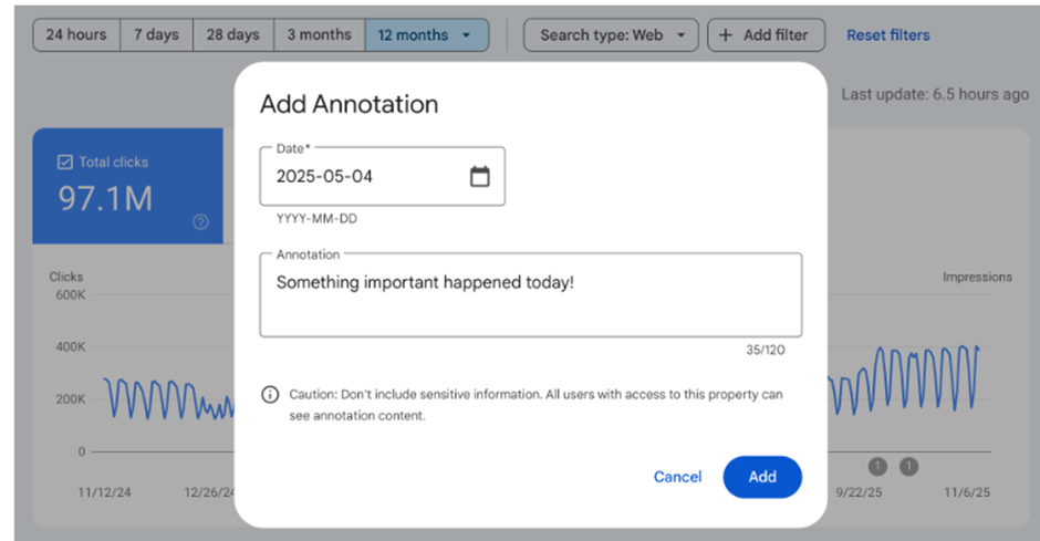Just as transformative is the introduction of contextual performance tracking through custom chart annotations. Until now, the story behind performance patterns — why something increased, when a change occurred, or how a campaign influenced traffic — lived outside of GSC. With the ability to annotate key dates directly within your performance timeline, GSC finally supports the kind of contextual visibility SEO teams have needed for years.