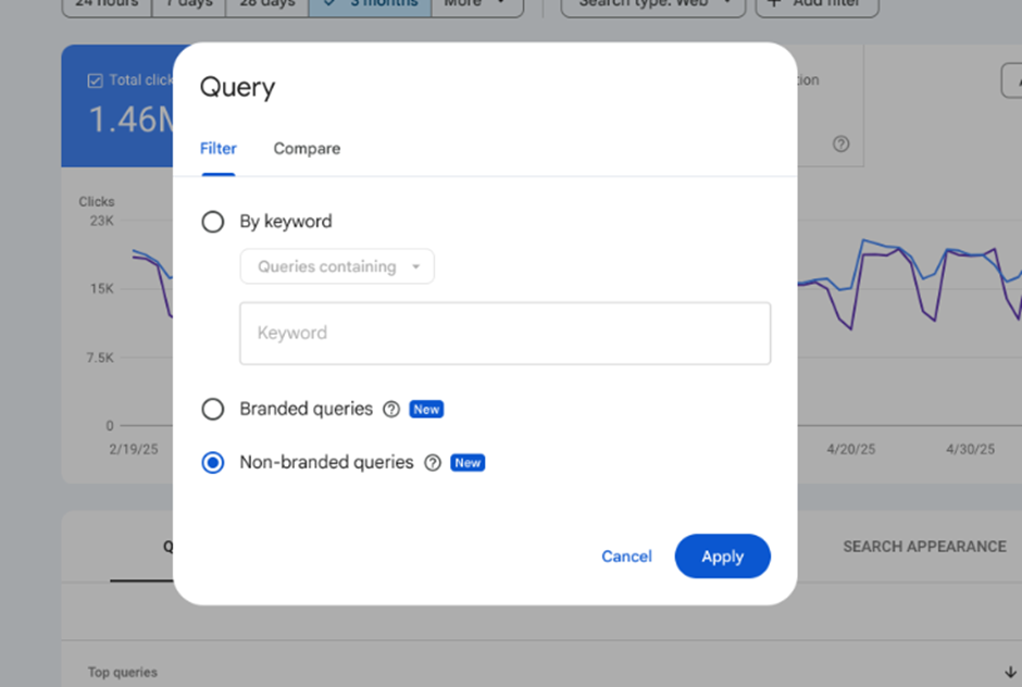 One of the biggest analytical limitations in GSC has been the inability to clearly separate branded vs non-branded search performance. Brand-driven traffic behaves very differently from discovery-driven traffic, and without segmentation, it’s easy to misinterpret growth or decline. Until this update, analysts had to manually build lists of branded terms or rely on regex filtering — a time-consuming and error-prone process.