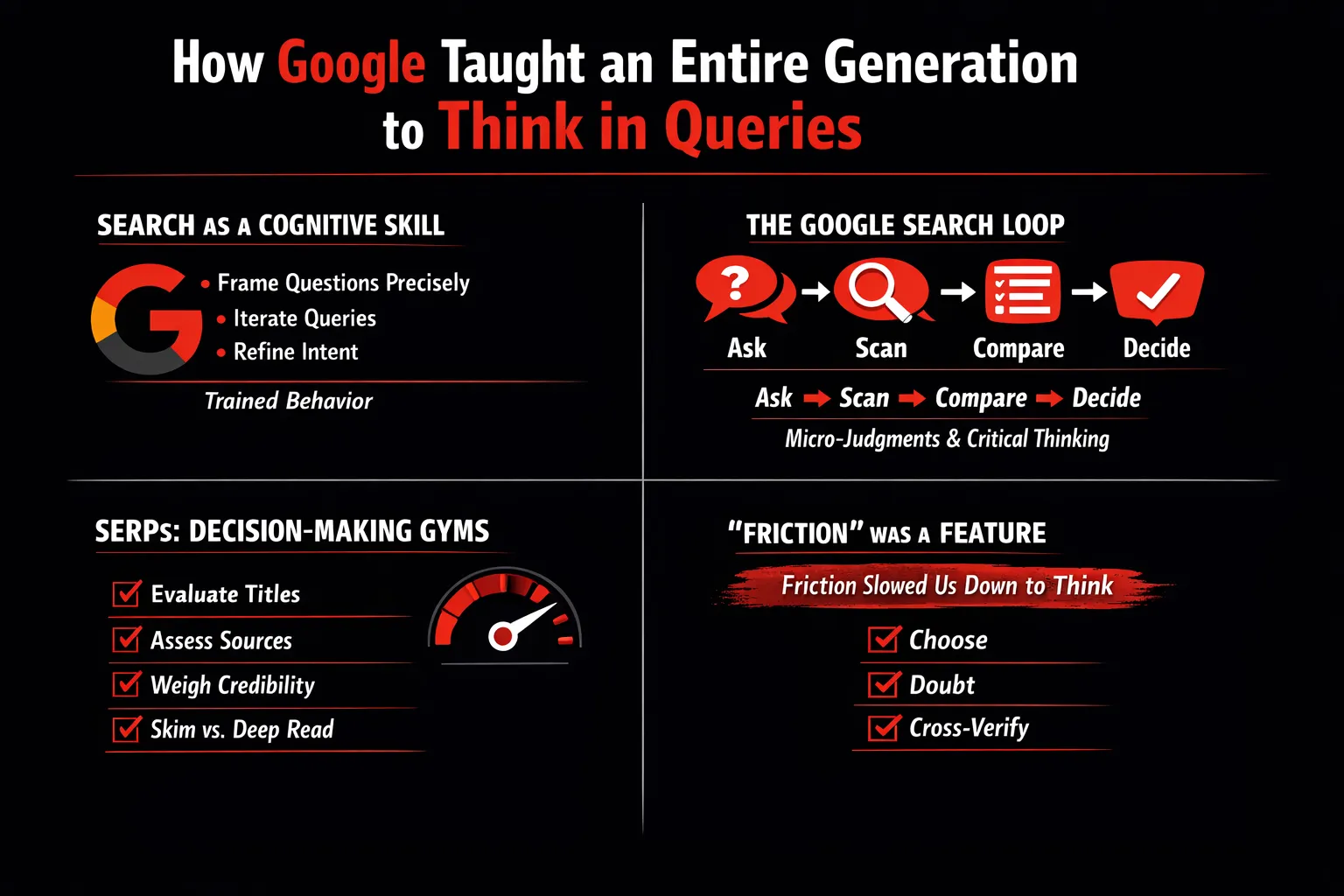 Importantly, Google forced a choice between skimming and deep reading. Some queries demanded quick answers; others required long-form engagement. That decision itself was cognitive work. Search didn’t just deliver information—it trained judgment.