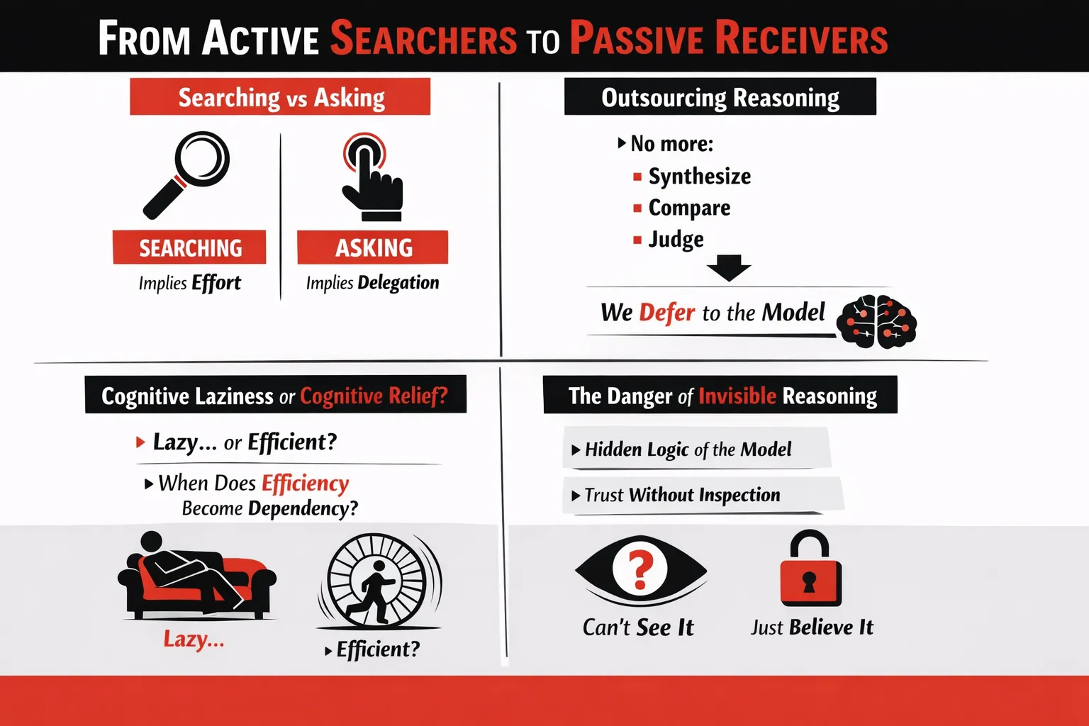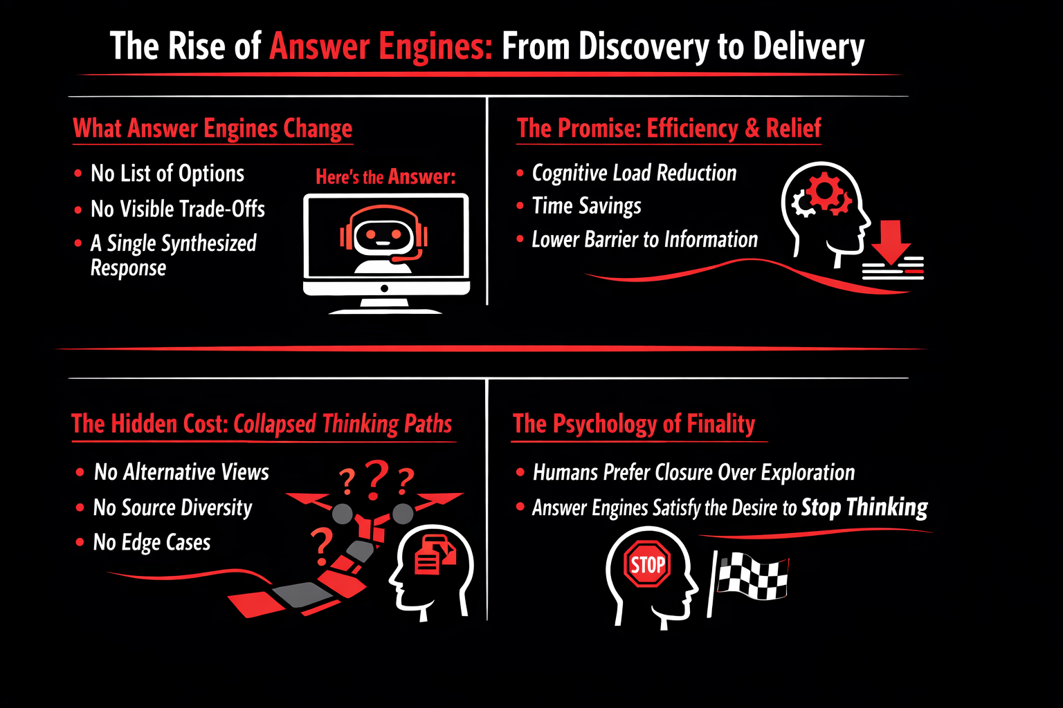 This is where the uncomfortable thesis begins. Google trained us to search. Answer engines are training us to accept. The shift is subtle but profound. It’s often framed as a story of efficiency—faster answers, fewer clicks, less wasted time. But efficiency isn’t the real issue. What’s happening is cognitive outsourcing: the gradual transfer of thinking tasks we once performed ourselves to systems designed to think on our behalf.