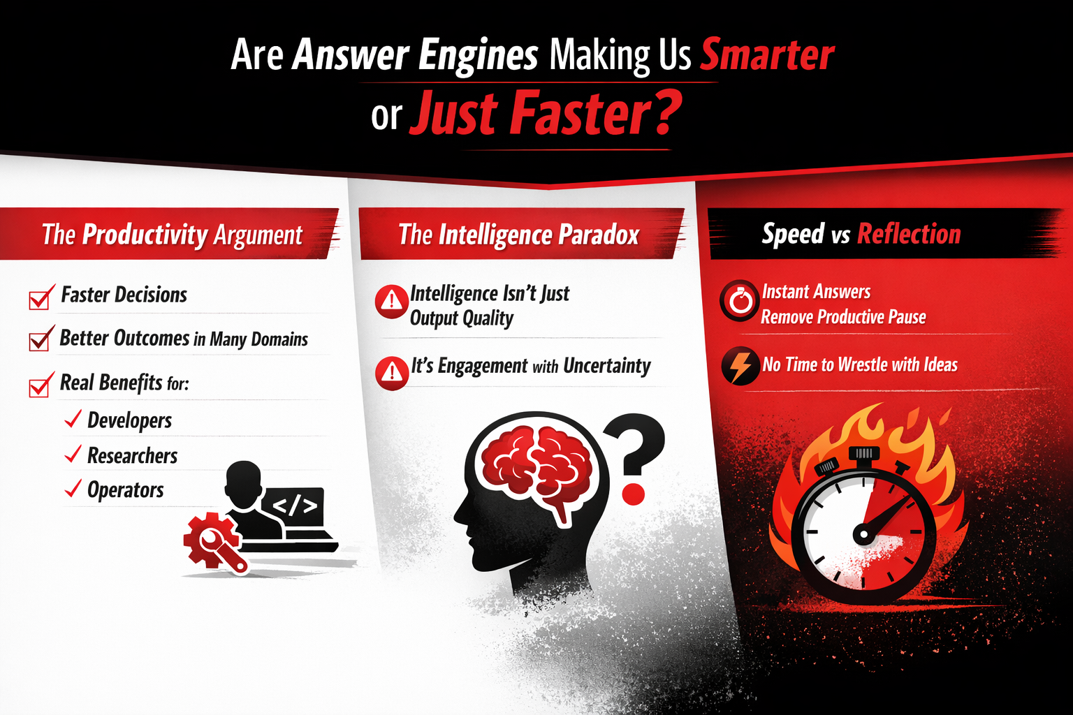 The strongest defense of answer engines is productivity. And it is a compelling one. For many tasks, answer engines dramatically reduce time-to-decision. A developer stuck on an error no longer needs to comb through Stack Overflow threads. A researcher can summarize unfamiliar domains in minutes instead of days. An operator can ask for a step-by-step process and move forward without hesitation. In these contexts, answer engines don’t just save time—they often lead to better outcomes.