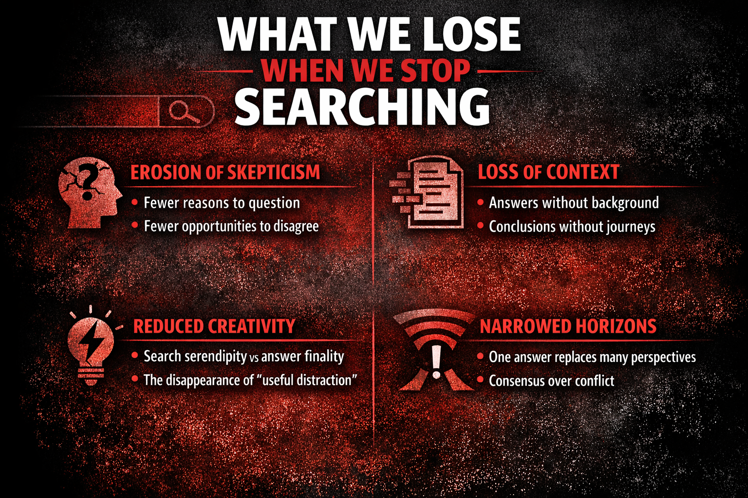 When search disappears, something subtle but important goes with it. The loss isn’t just about fewer clicks or less web traffic—it’s about how our minds engage with information. Searching forced us into a posture of active doubt. Answer engines, by contrast, often place us in a posture of passive acceptance. Over time, this shift changes how we question, how we understand, and how broadly we think.