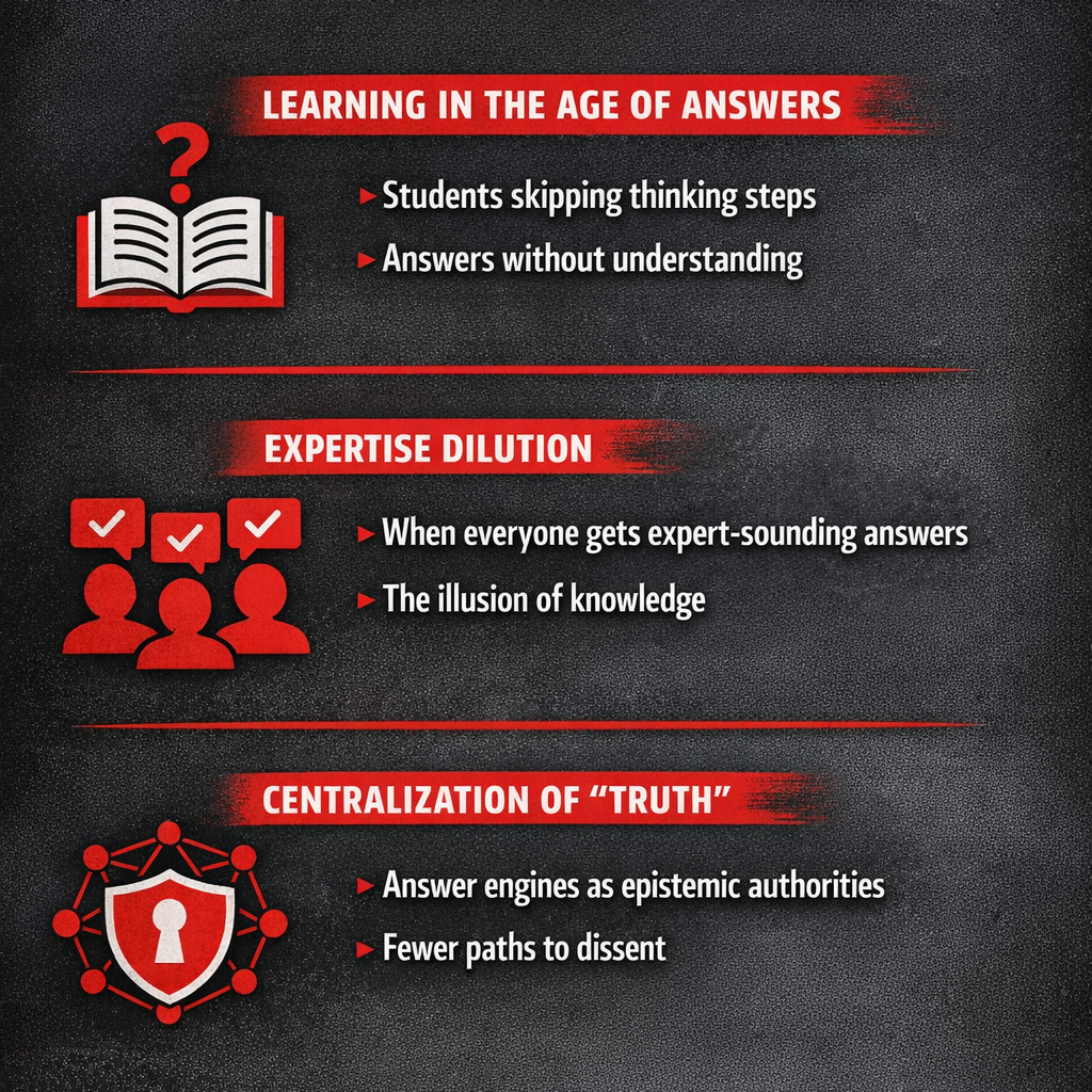 Answer engines also blur the boundary between expertise and access. When everyone can generate expert-sounding explanations on demand, the social signals that once distinguished deep knowledge from surface familiarity begin to erode. Fluency replaces mastery. Confidence replaces competence.