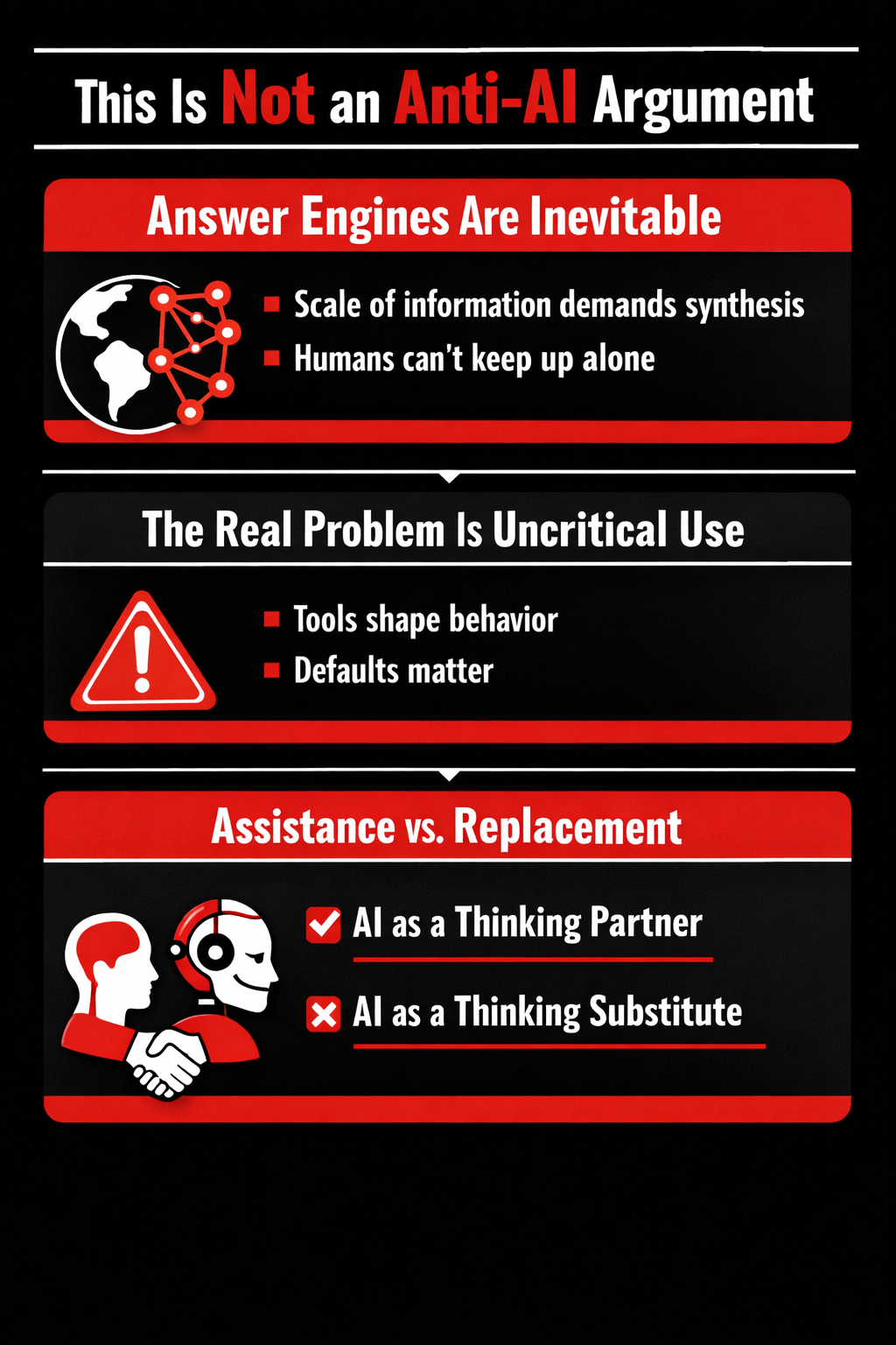 The future does not require rejecting answer engines. It requires resisting the temptation to let them think instead of us. The real risk is not artificial intelligence—it is artificial certainty.