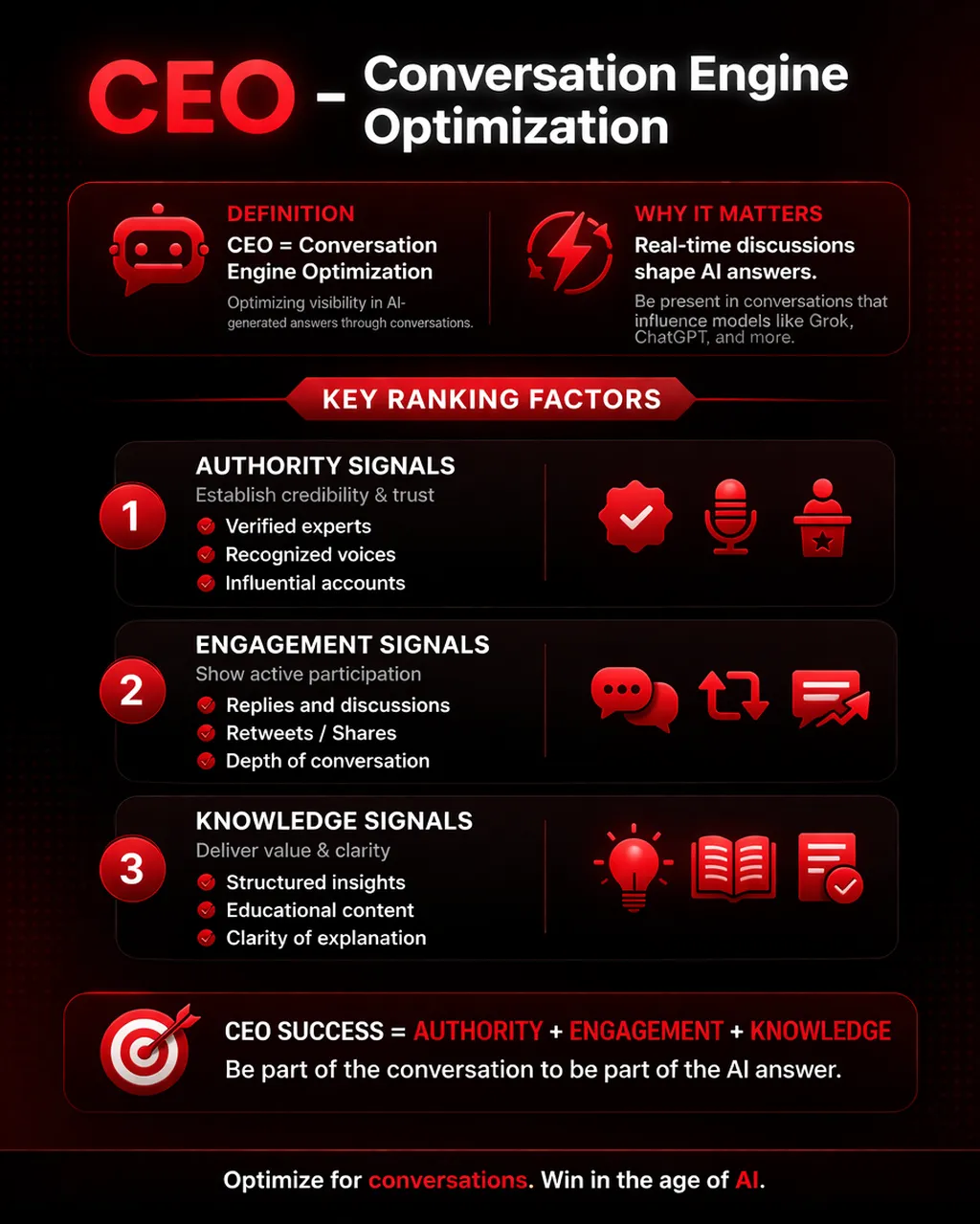 Conversation Engine Optimization (CEO) is the practice of optimizing your presence so that AI models surface your insights, opinions, or content within generated responses—especially those derived from real-time discussions across platforms.