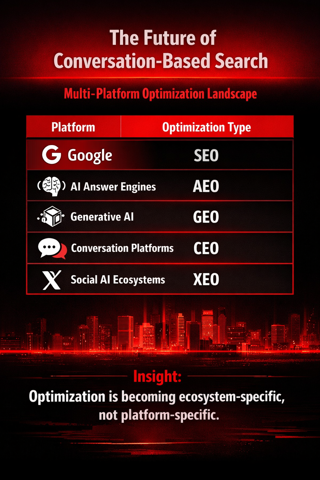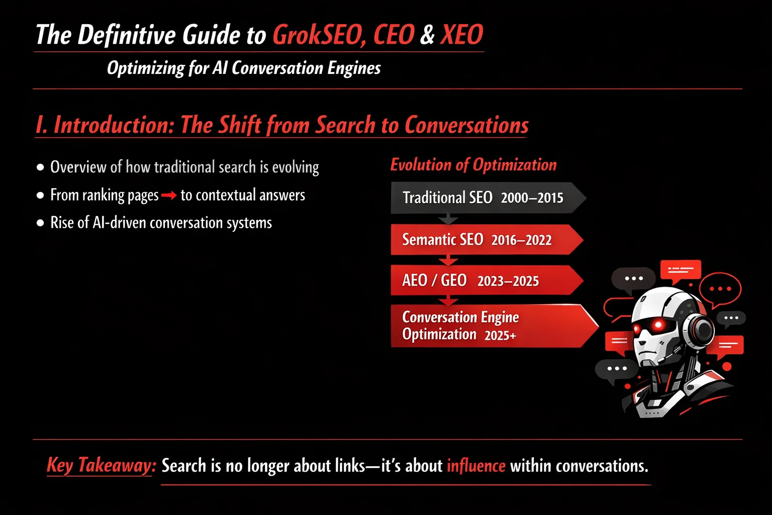 - Conversation Engine Optimization (2025+): Centers on influence within AI-driven discussions